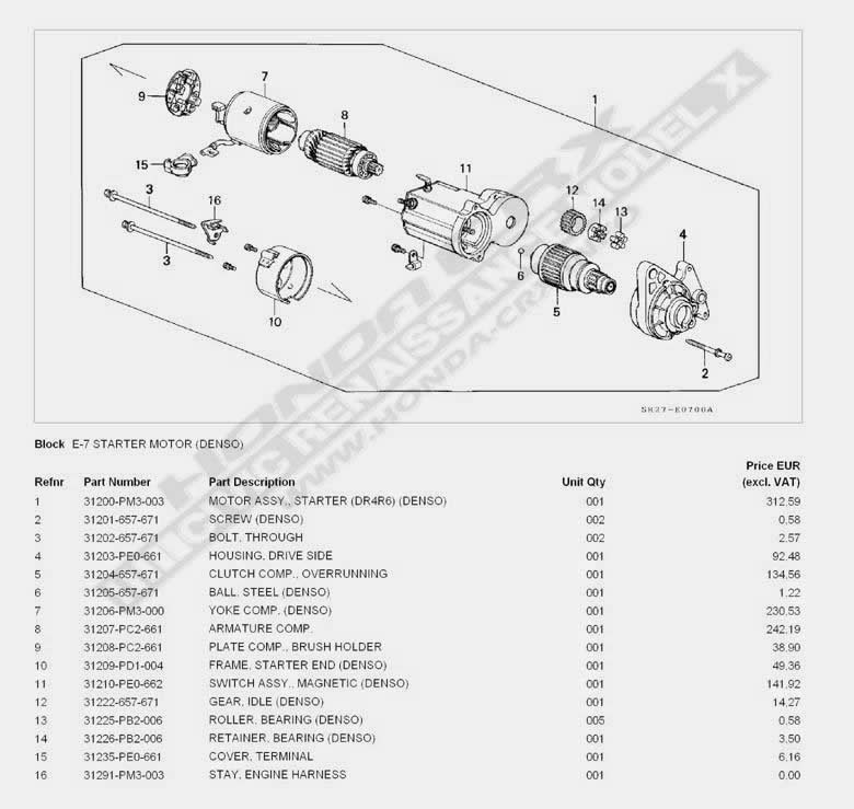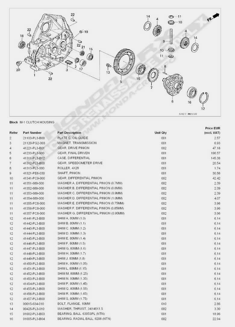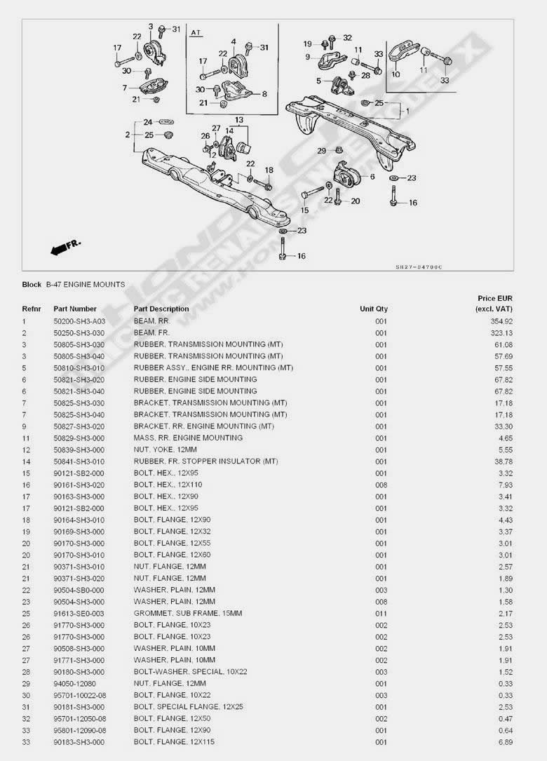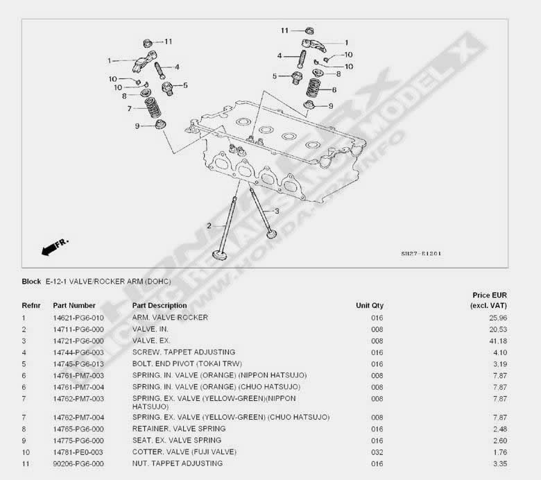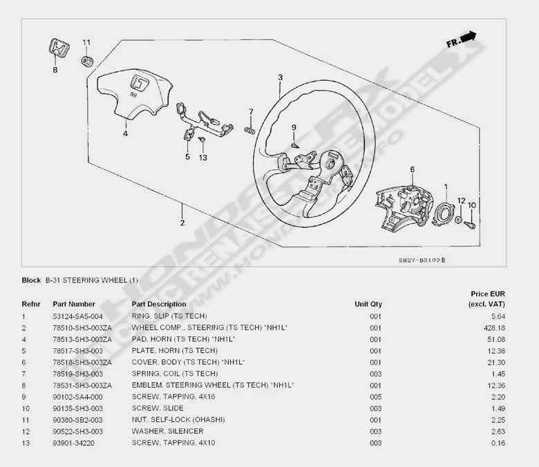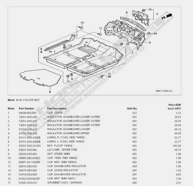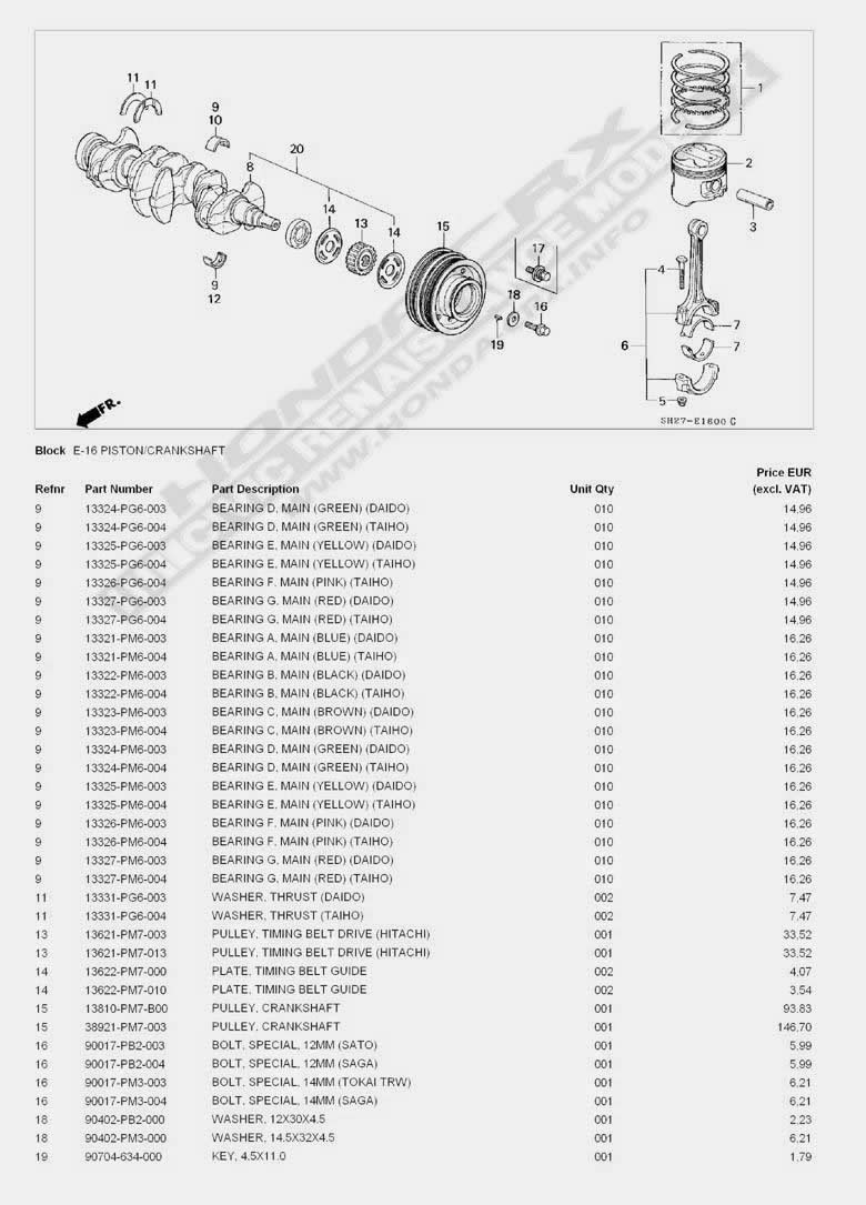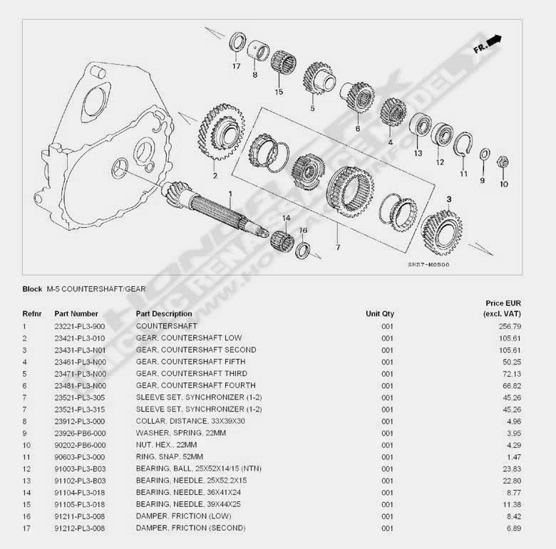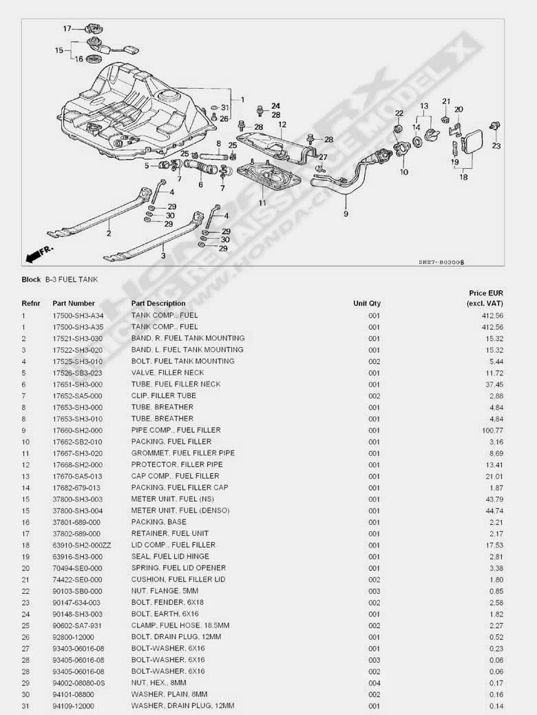 Ceny podane w schematach nie powinny się one specjalnie różnić w przyszłości od tych cen w serwisie Hondy - zwykle sa to wahania "o grosze". Ceny podane są w EURO bez podatku VAT (u nas jest to 22%, w niemczech 16%). Jeśli macie na obrazku nieco więcej części które Waszym zdaniem nie pasują do tego akurat modelu... to faktycznie może tak być :) Części które są potrzebne w danym modelu.. z danego schematu, sa wymienione niżej - razem z cenami. Często są schematy zbiorcze do wszystkich typów, tylko wybrane elementy z obrazka są właściwe.