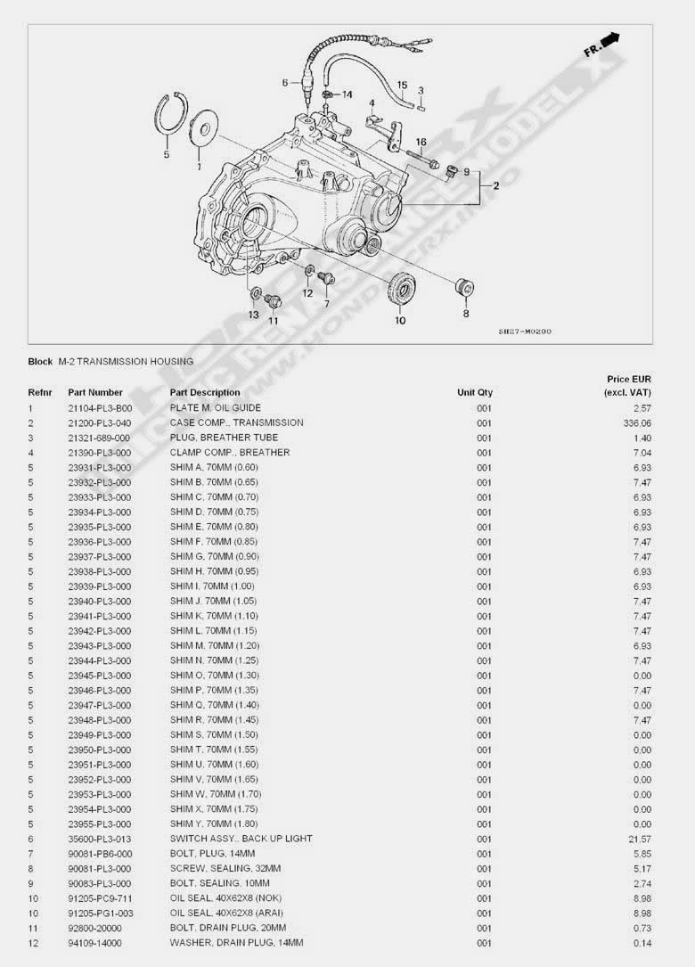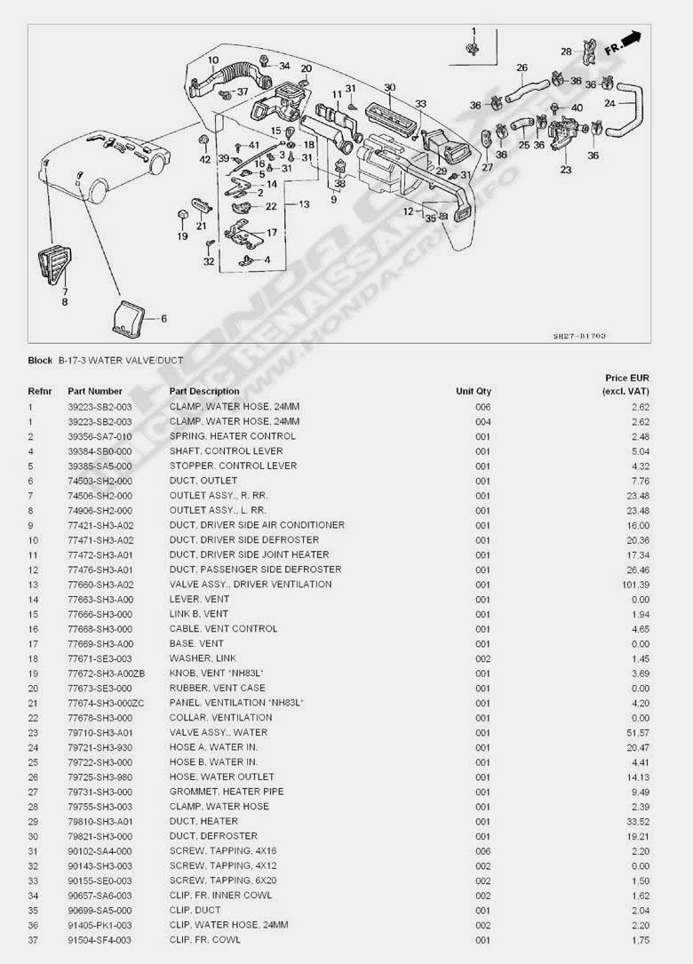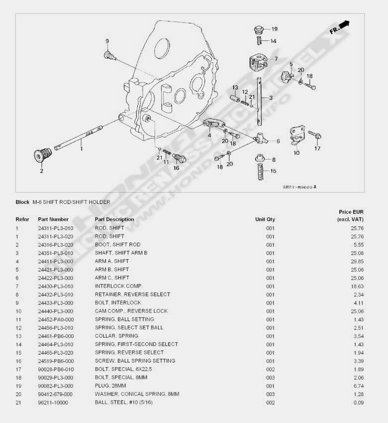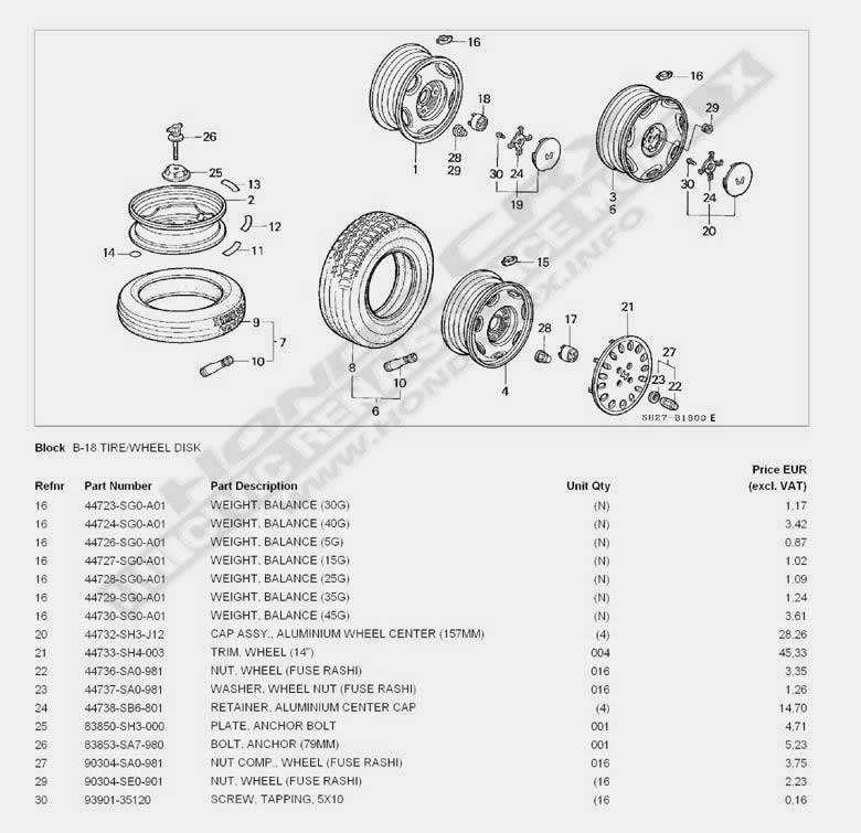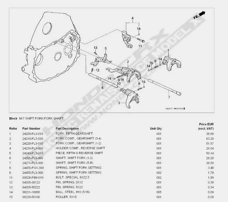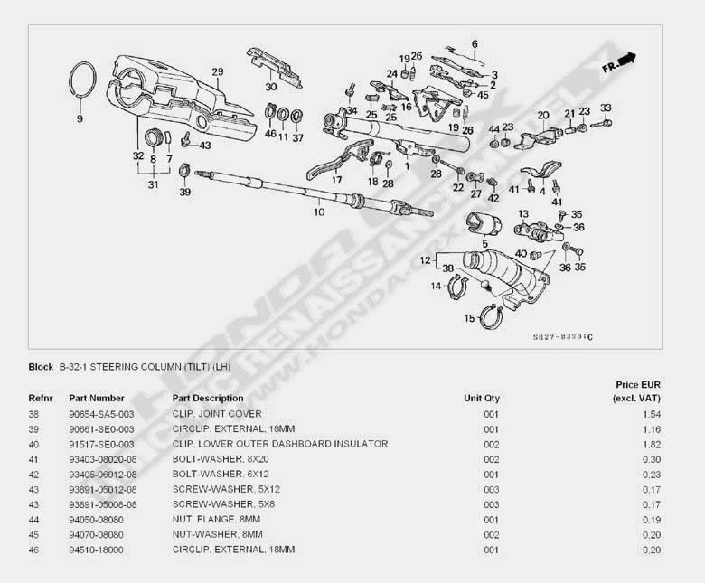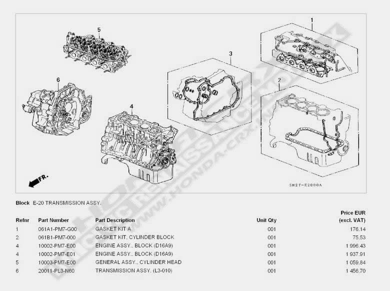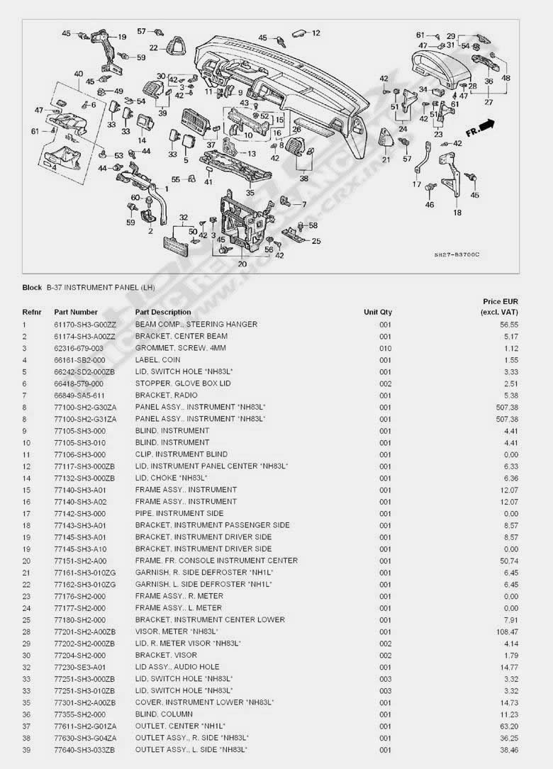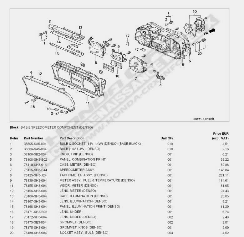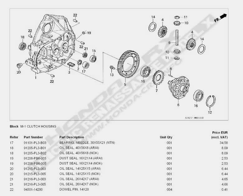 Ceny podane w schematach nie powinny się one specjalnie różnić w przyszłości od tych cen w serwisie Hondy - zwykle sa to wahania "o grosze". Ceny podane są w EURO bez podatku VAT (u nas jest to 22%, w niemczech 16%). Jeśli macie na obrazku nieco więcej części które Waszym zdaniem nie pasują do tego akurat modelu... to faktycznie może tak być :) Części które są potrzebne w danym modelu.. z danego schematu, sa wymienione niżej - razem z cenami. Często są schematy zbiorcze do wszystkich typów, tylko wybrane elementy z obrazka są właściwe.
