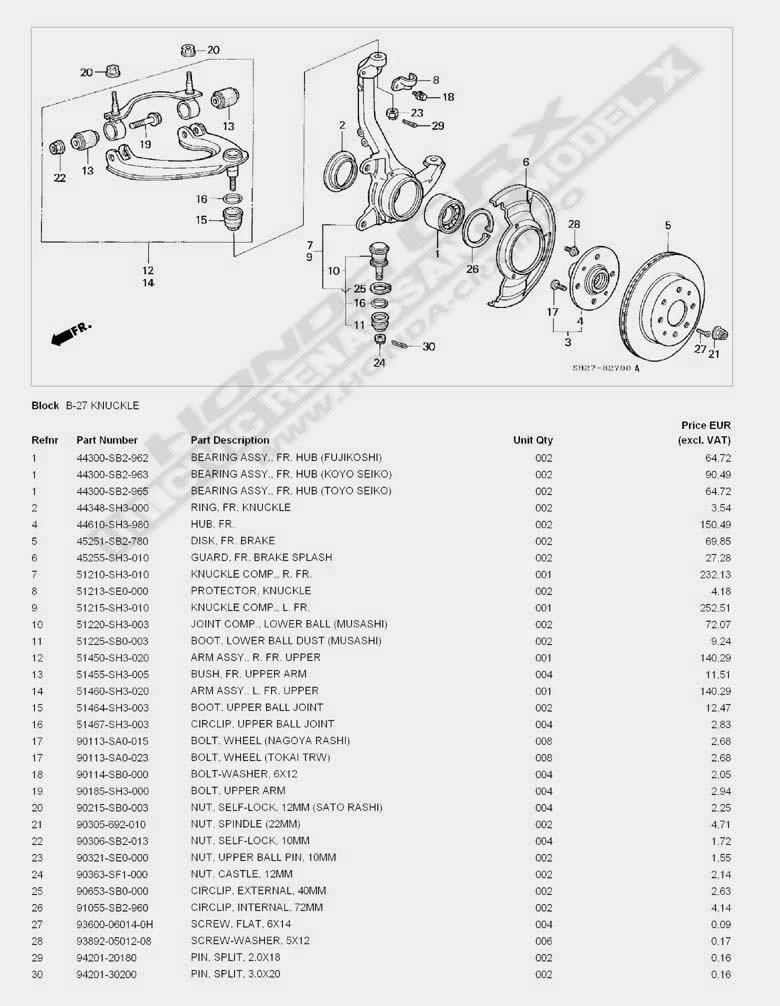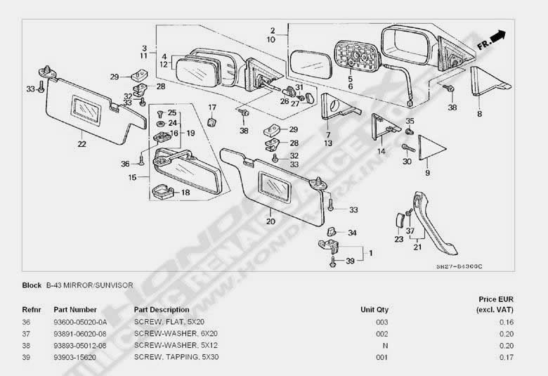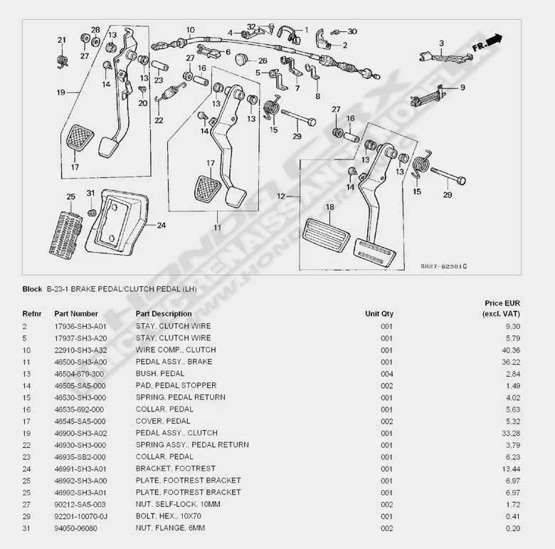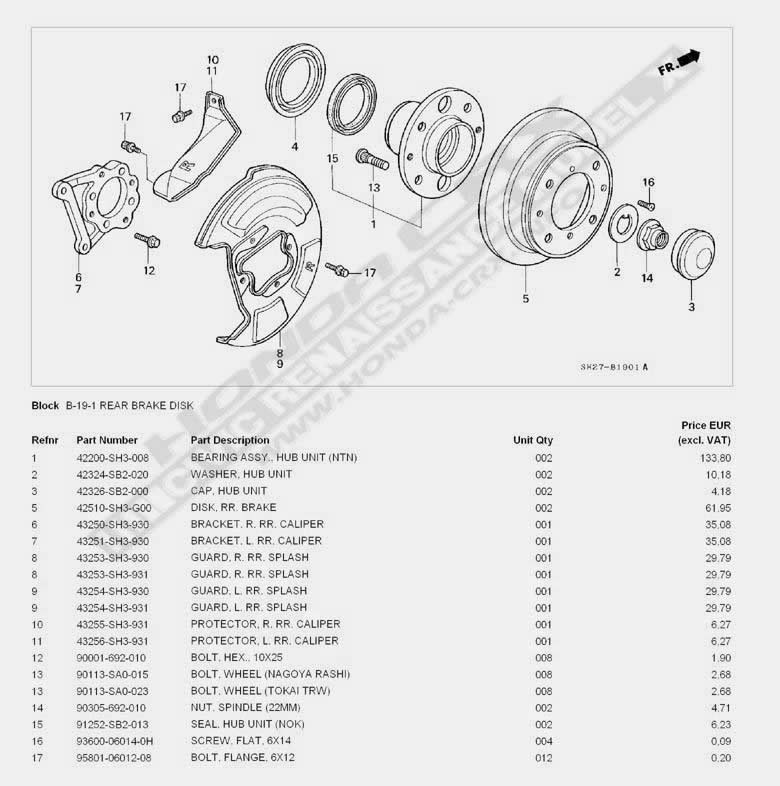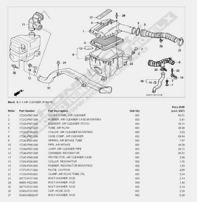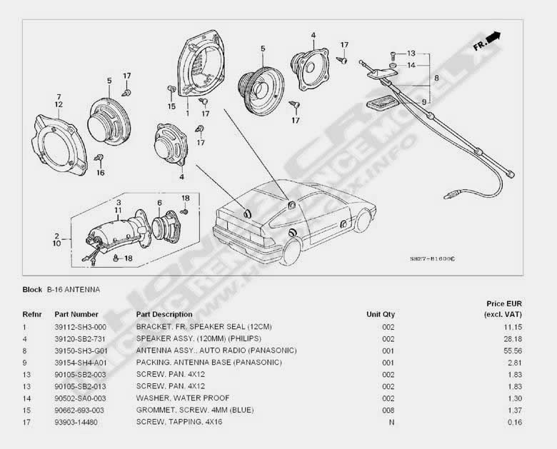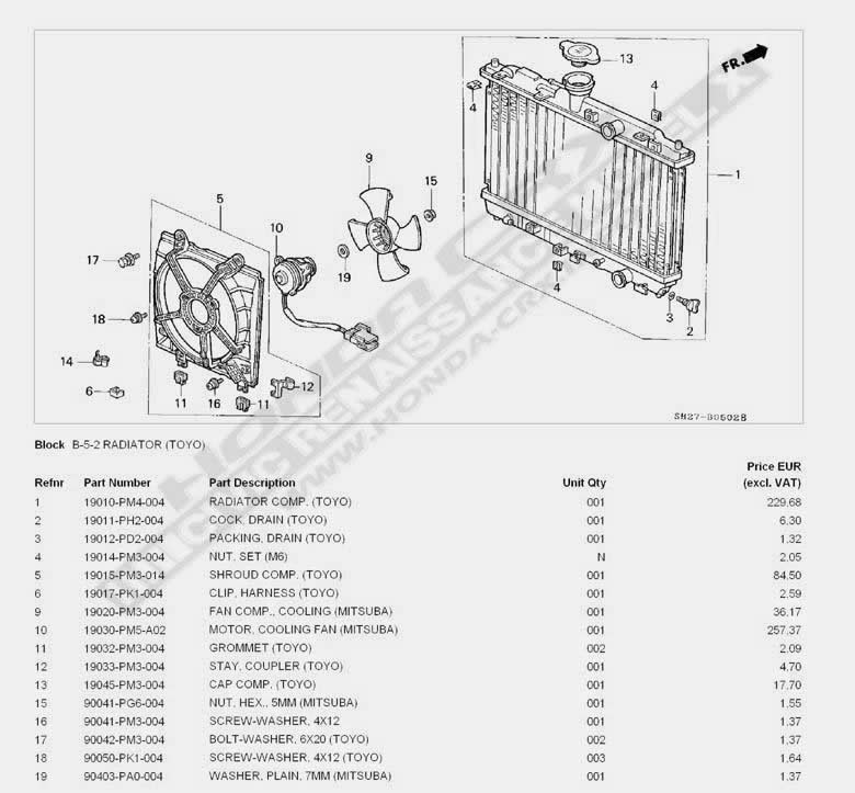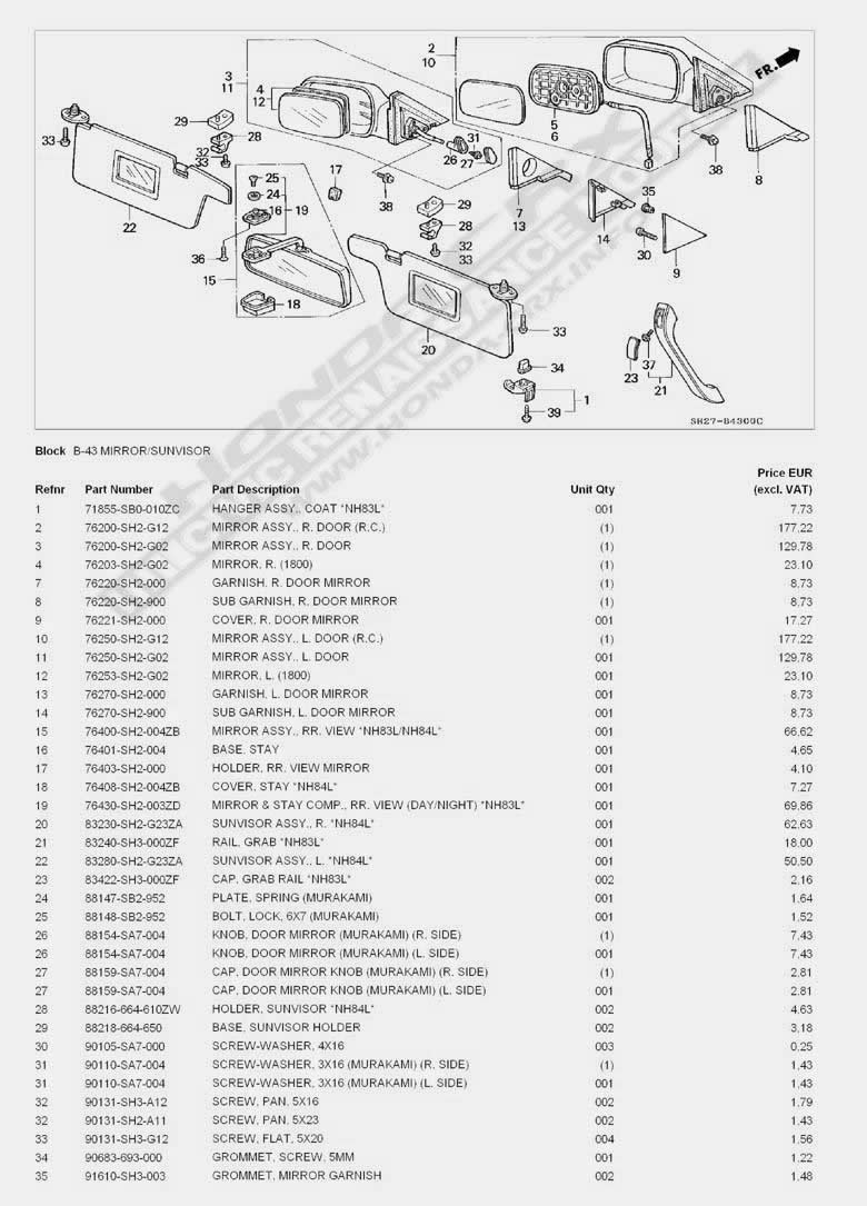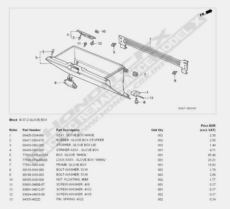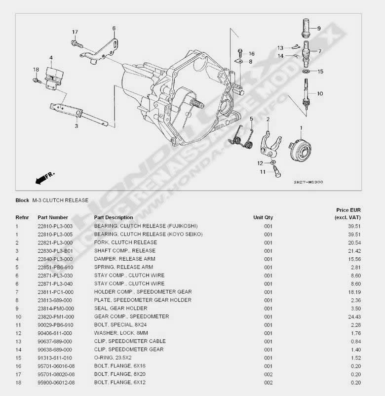 Ceny podane w schematach nie powinny się one specjalnie różnić w przyszłości od tych cen w serwisie Hondy - zwykle sa to wahania "o grosze". Ceny podane są w EURO bez podatku VAT (u nas jest to 22%, w niemczech 16%). Jeśli macie na obrazku nieco więcej części które Waszym zdaniem nie pasują do tego akurat modelu... to faktycznie może tak być :) Części które są potrzebne w danym modelu.. z danego schematu, sa wymienione niżej - razem z cenami. Często są schematy zbiorcze do wszystkich typów, tylko wybrane elementy z obrazka są właściwe.