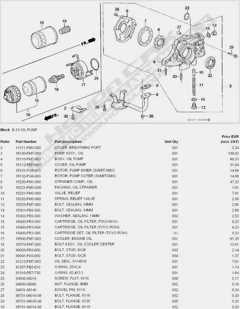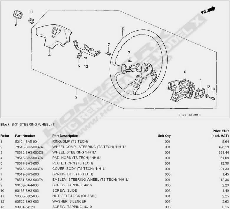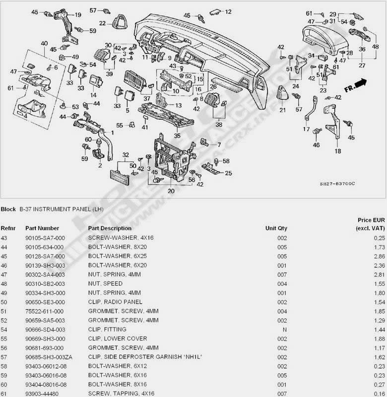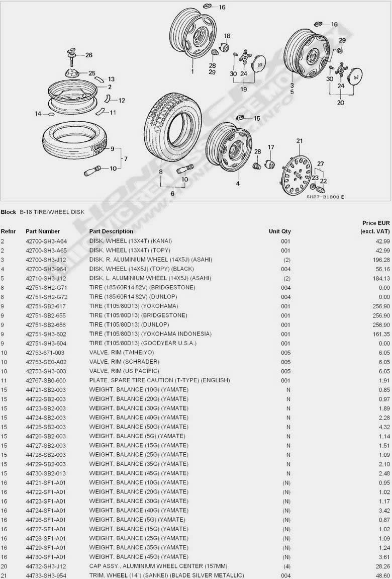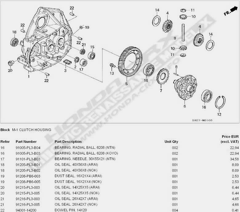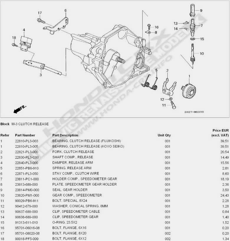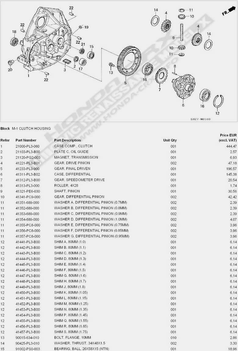 Ceny podane w schematach nie powinny się one specjalnie różnić w przyszłości od tych cen w serwisie Hondy - zwykle sa to wahania "o grosze". Ceny podane są w EURO bez podatku VAT (u nas jest to 22%, w niemczech 16%). Jeśli macie na obrazku nieco więcej części które Waszym zdaniem nie pasują do tego akurat modelu... to faktycznie może tak być :) Części które są potrzebne w danym modelu.. z danego schematu, sa wymienione niżej - razem z cenami. Często są schematy zbiorcze do wszystkich typów, tylko wybrane elementy z obrazka są właściwe.